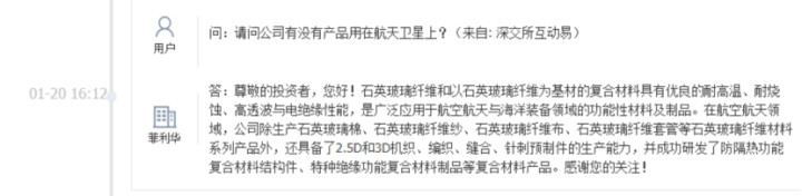 隔热材料:公司1月20日在互动平台上表示,公司的石英玻璃纤维和以石英玻璃纤维为基材的复合材料具有优良的耐高温、耐烧蚀、高透波与电绝缘性能,是广泛应用于航空航天与海洋装备领域的功能性材料及制品。在航空航天领域,公司除生产石英玻璃棉、石英玻璃纤维纱、石英玻璃纤维布、石英玻璃纤维套管等石英玻璃纤维材料系列产品外,还具备了2.5D和3D机织、编织、缝合、针刺预制件的生产能力,并成功研发了防隔热功能复合材料结构件、特种绝缘功能复合材料制品等复合材料产品。