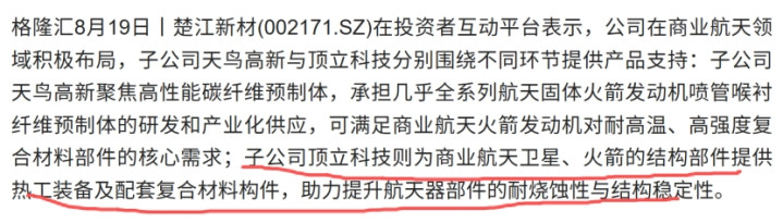 隔热材料:子公司天鸟高新聚焦高性能碳纤维预制体,承担几乎全系列航天固体火箭发动机喷管喉衬纤维预制体的研发和产业化供应;子公司顶立科技则为商业航天卫星、火箭的结构部件提供热工装备及配套复合材料构件