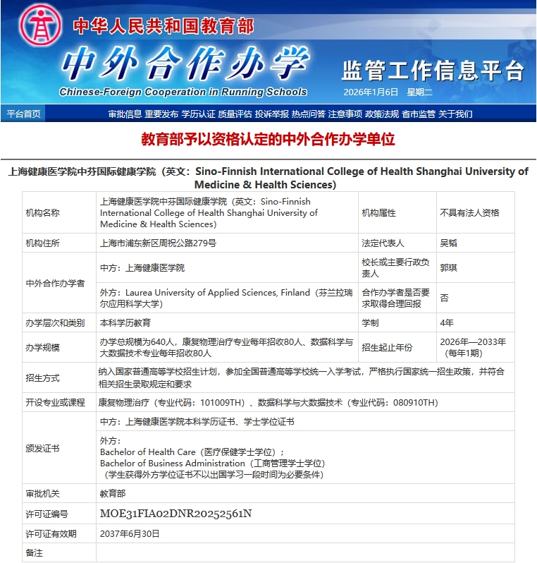 教育部日前公布中外合作办学机构和项目相关信息显示,在上海通过复核的本科及以上层次中外合作办学机构中,上海健康医学院中芬国际健康学院正式获批设立。新学院2026年首招,将填补上海地区在康复物理治疗、数据科学与大数据技术专业本科学历层次中外合作办学的空白。